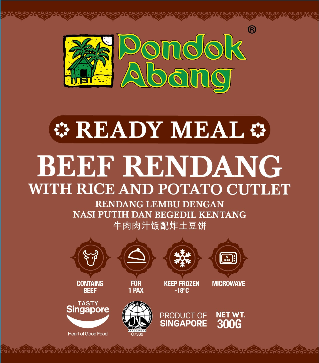 Enjoy Pondok Abang's Beef Rendang with Rice and Potato Cutlet meal in less than 5 minutes! This signature meal is prepared AUTHENTICALLY with high quality beef, rice, and Pondok Abang's signature Potato Cutlet. Serves 1 pax.